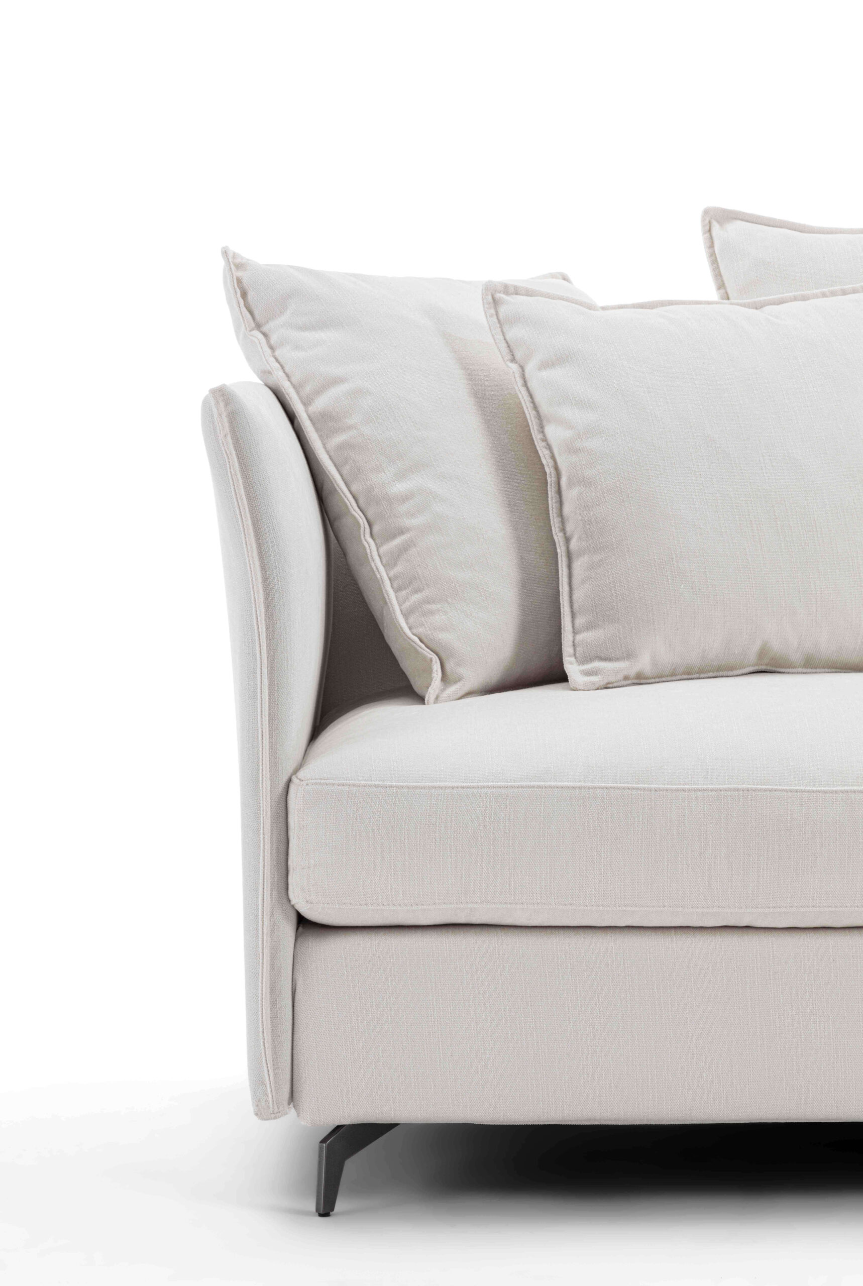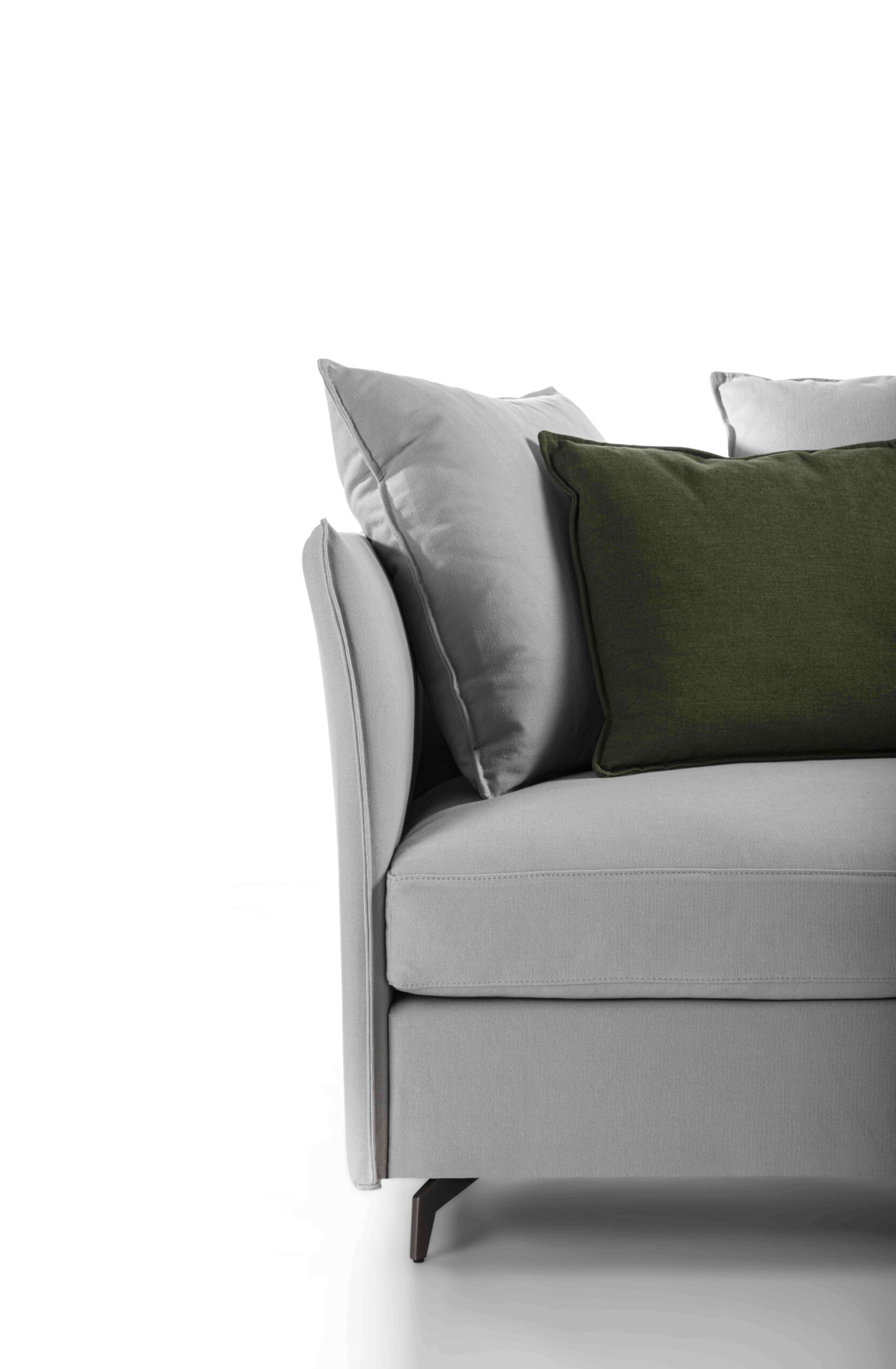 Può creare movimento quando combinato con moduli senza schienale come pouf, oppure trasmettere maggiore stabilità quando unito ad altre unità tradizionali. La configurazione angolare rappresenta un ulteriore punto di forza del progetto. Raggiungibile semplicemente accostando i vari moduli tra loro, questa soluzione apre a infinite possibilità compositive, garantendo sempre coerenza estetica e funzionalità.