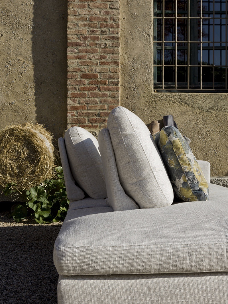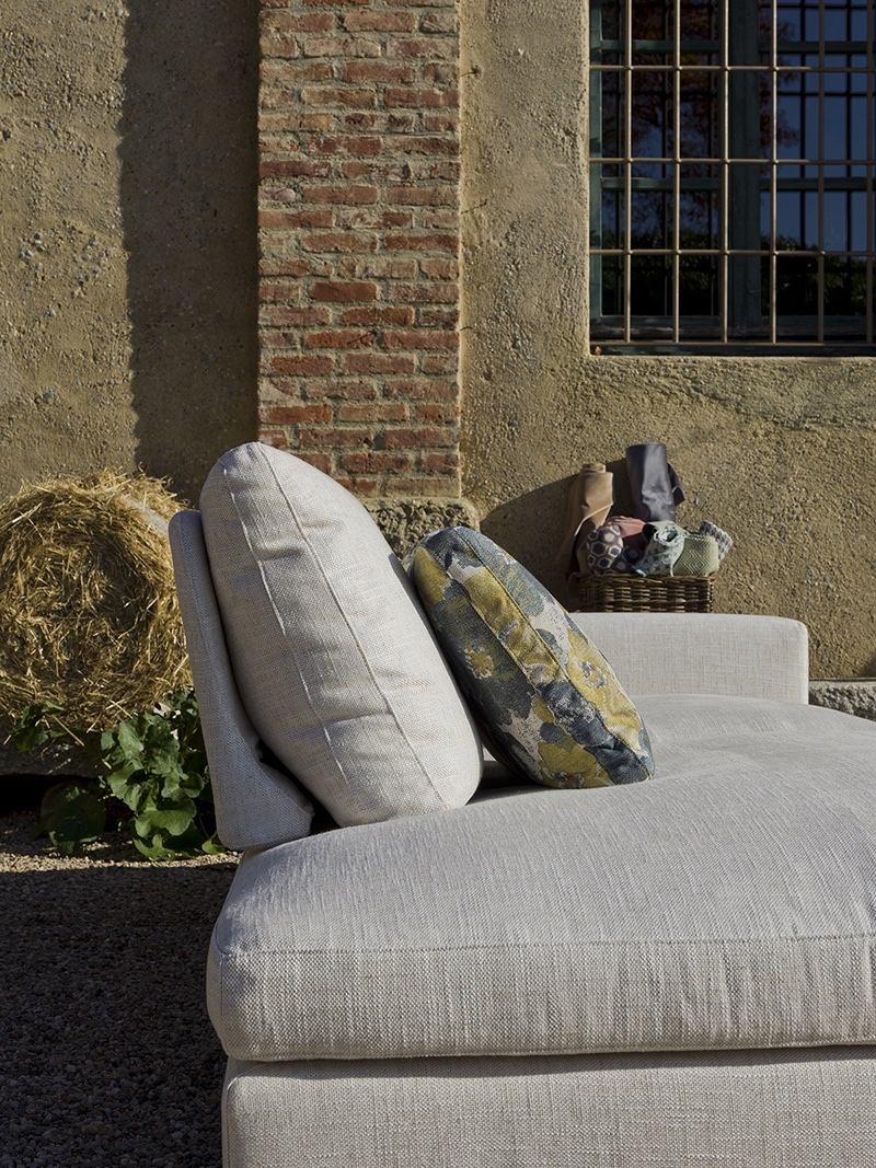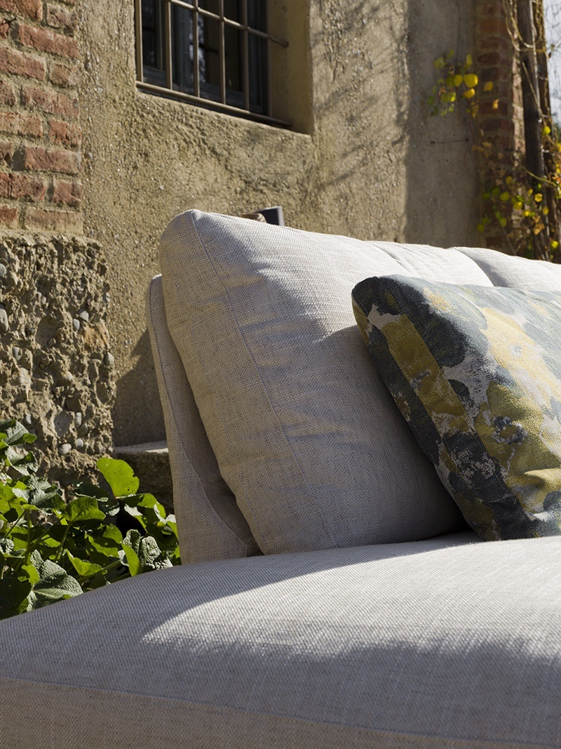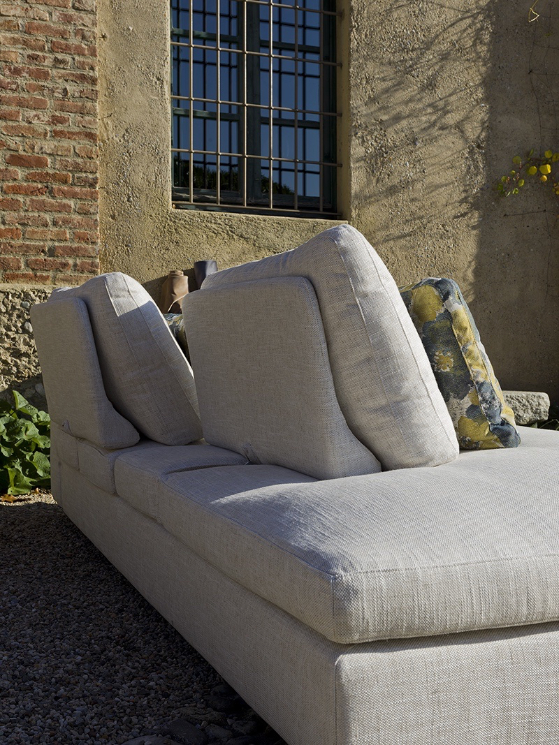 Nella seconda configurazione, invece, lo schienale viene avanzato, favorendo una postura ideale per momenti di conversazione, lettura o attività in cui è richiesta una posizione più composta e ordinata, senza rinunciare al comfort. Per consentire questa transizione fluida, il sedile è stato progettato con una lavorazione che accompagna il movimento in modo armonioso. Il risultato è un sistema di sedute versatile, capace di conferire al modello un‘elegante dinamicità.
