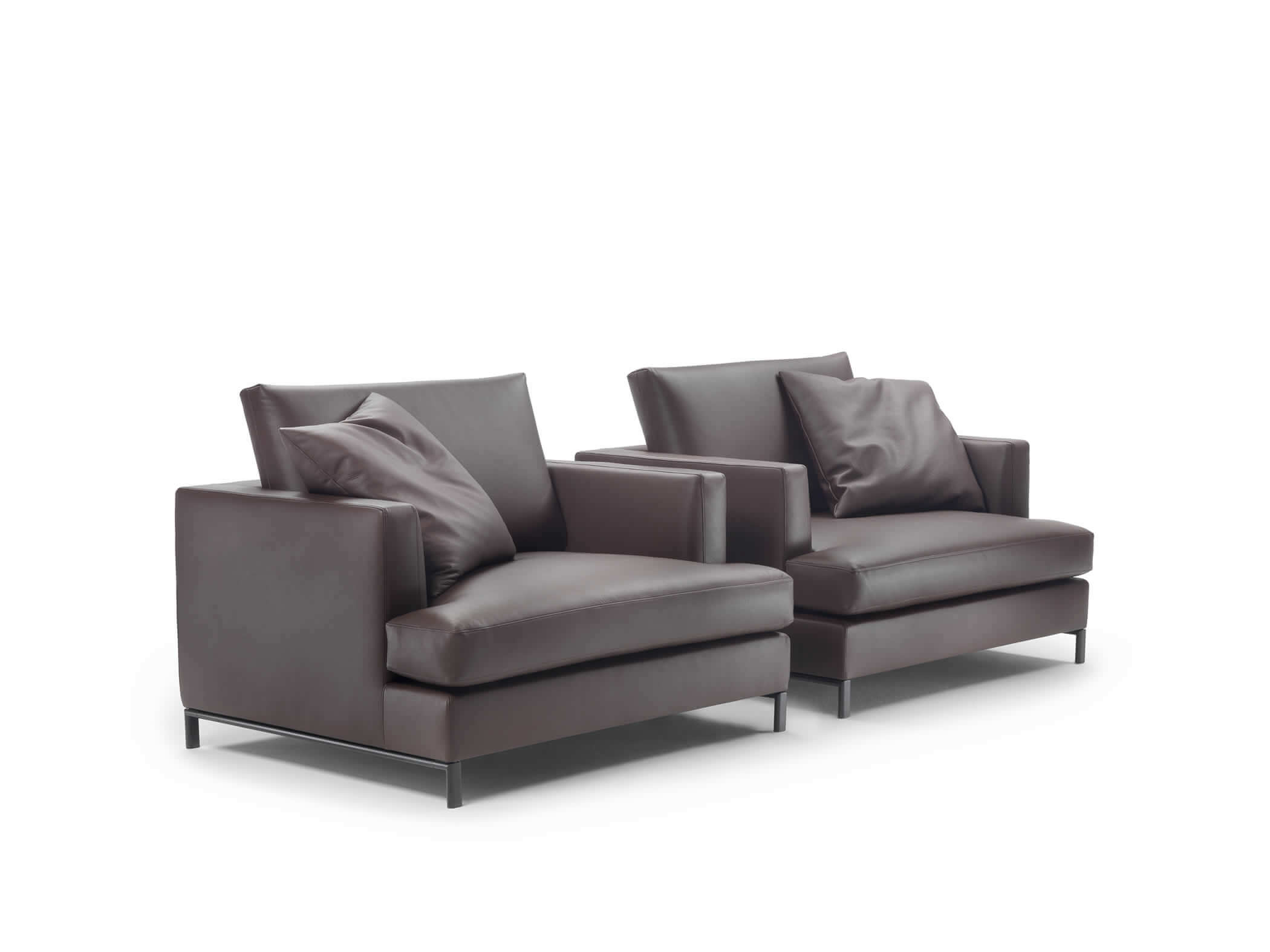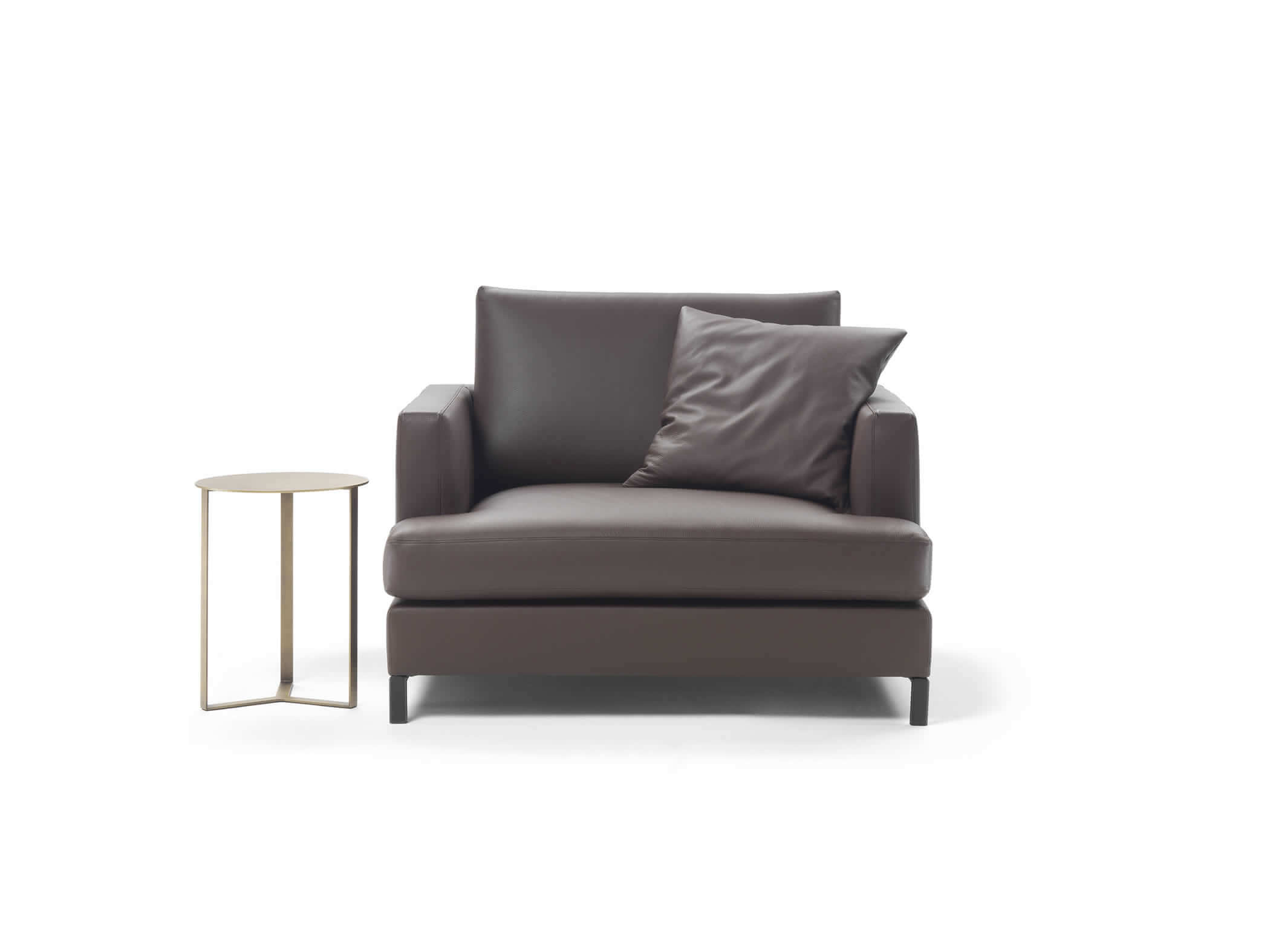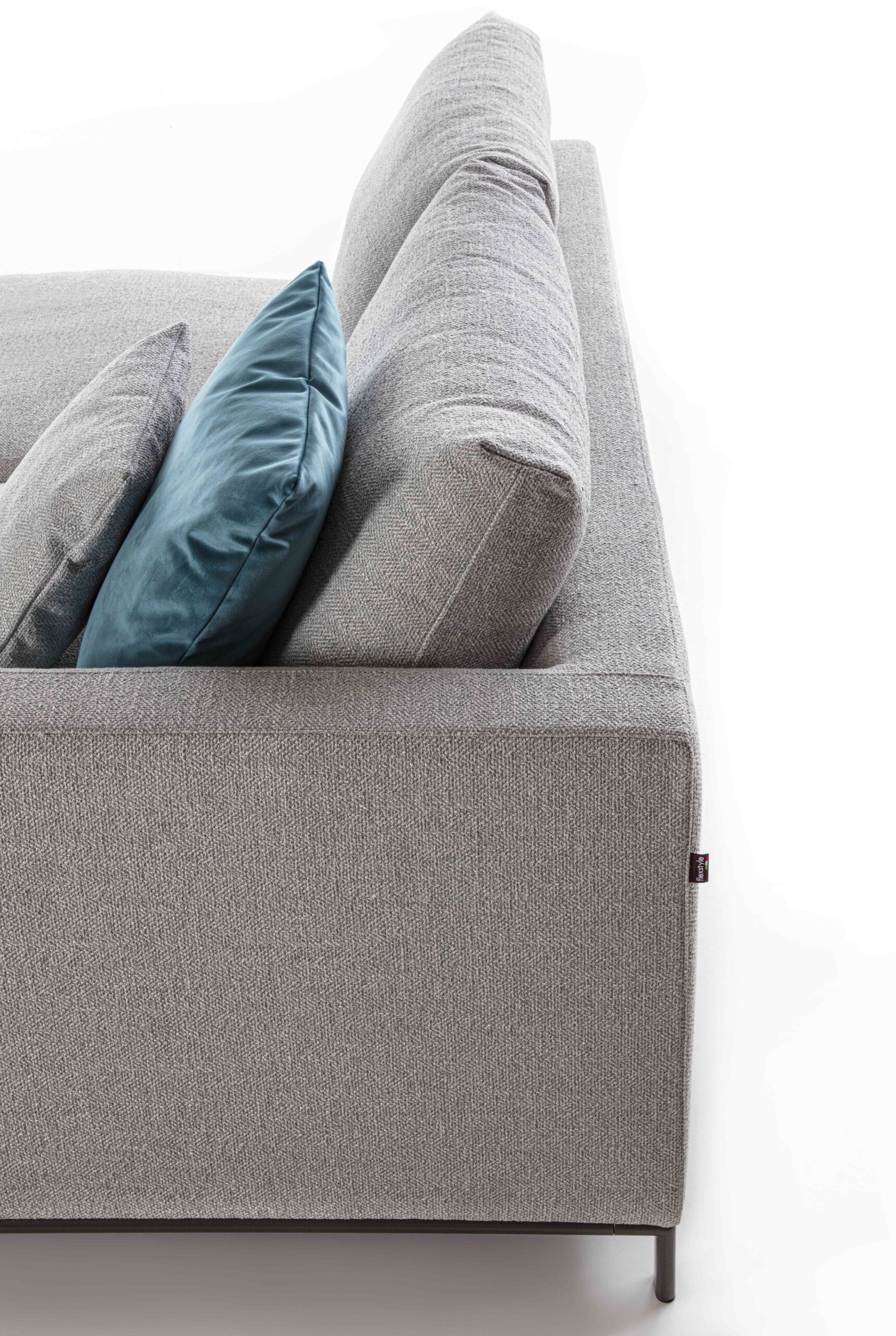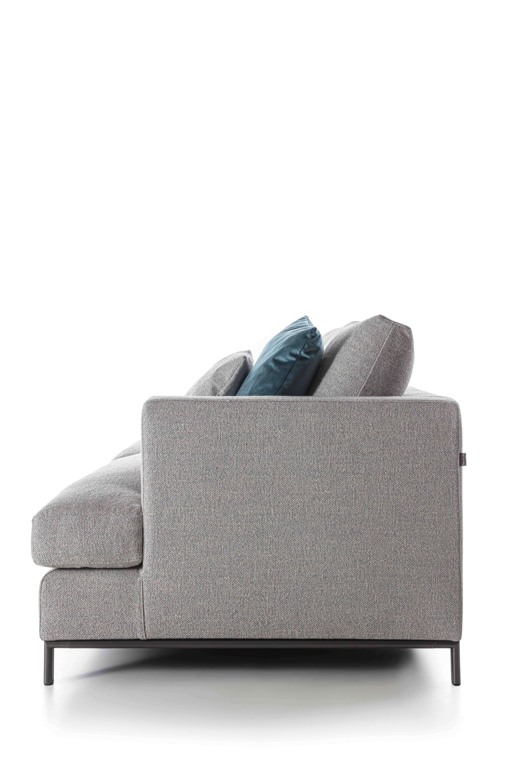 La seduta risulta così accogliente e rilassante, mentre lo schienale, anch’esso imbottito in piuma, garantisce un supporto equilibrato e leggero. Ogni dettaglio del divano Dallas è studiato per unire funzionalità ed estetica, rendendolo immediatamente riconoscibile e unico nel suo genere. La struttura della base, ad esempio, è realizzata con un tubolare in metallo color bronzo, un elemento che introduce una nota cromatica discreta ma significativa, completando il design con un tocco di stile contemporaneo. L’intera composizione si basa su un linguaggio di design ricercato, capace di fondere equilibrio estetico e praticità d’uso.