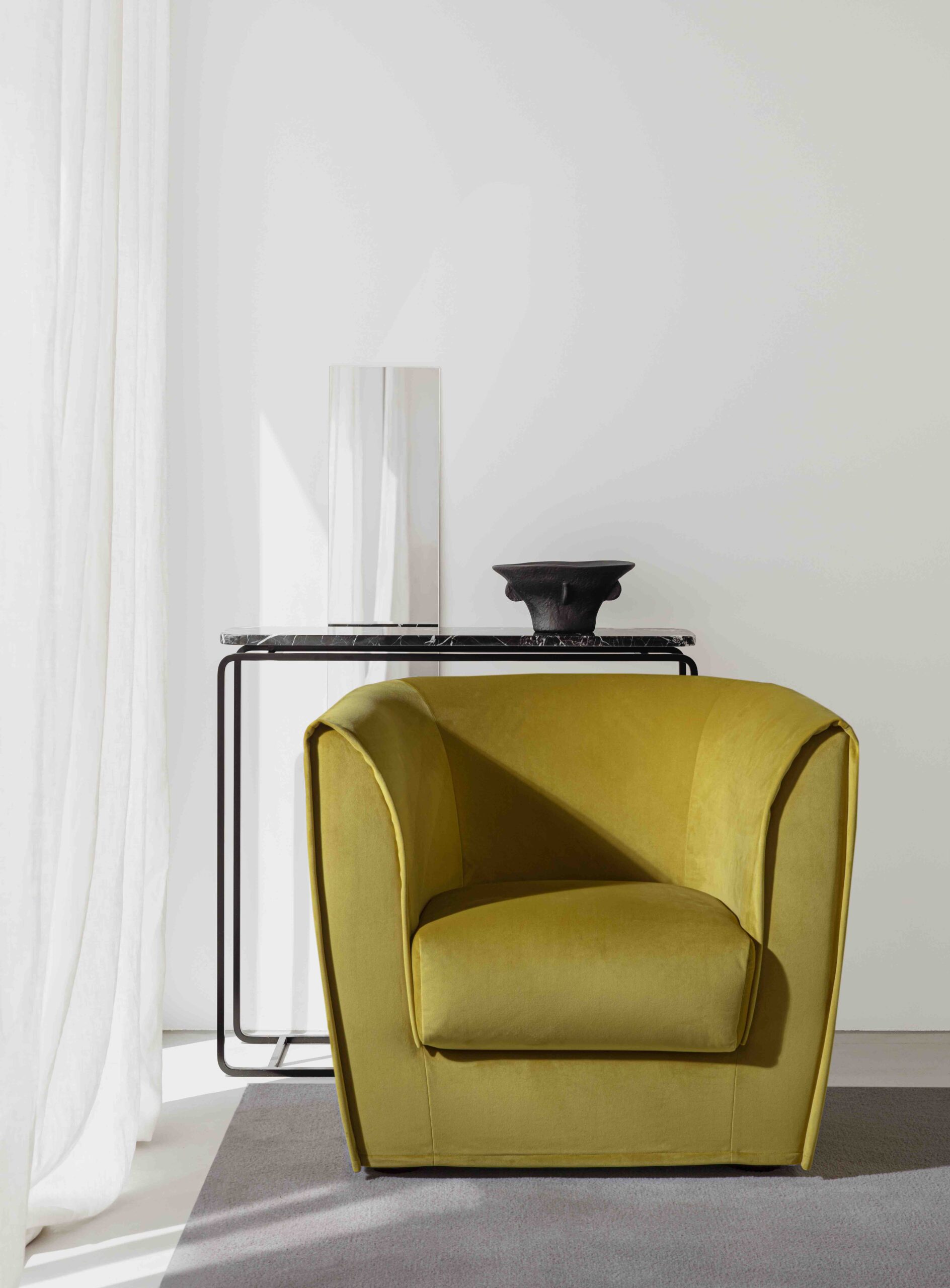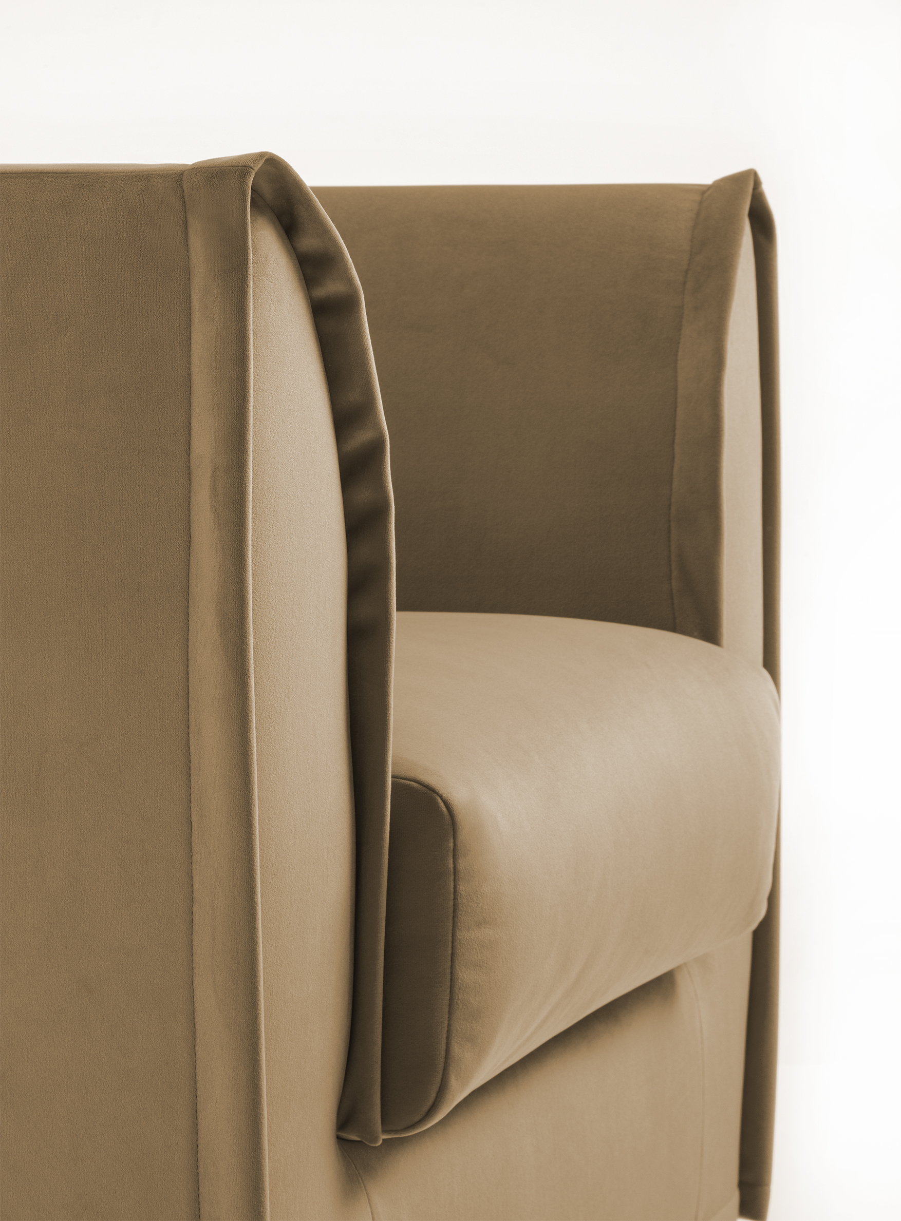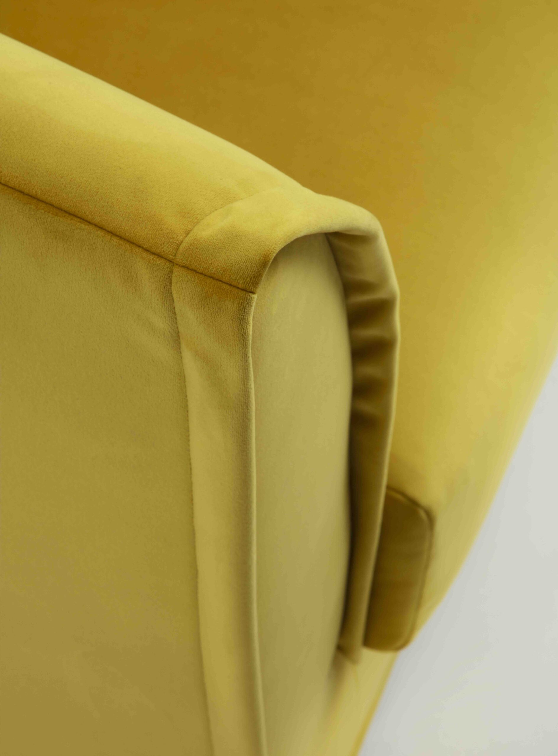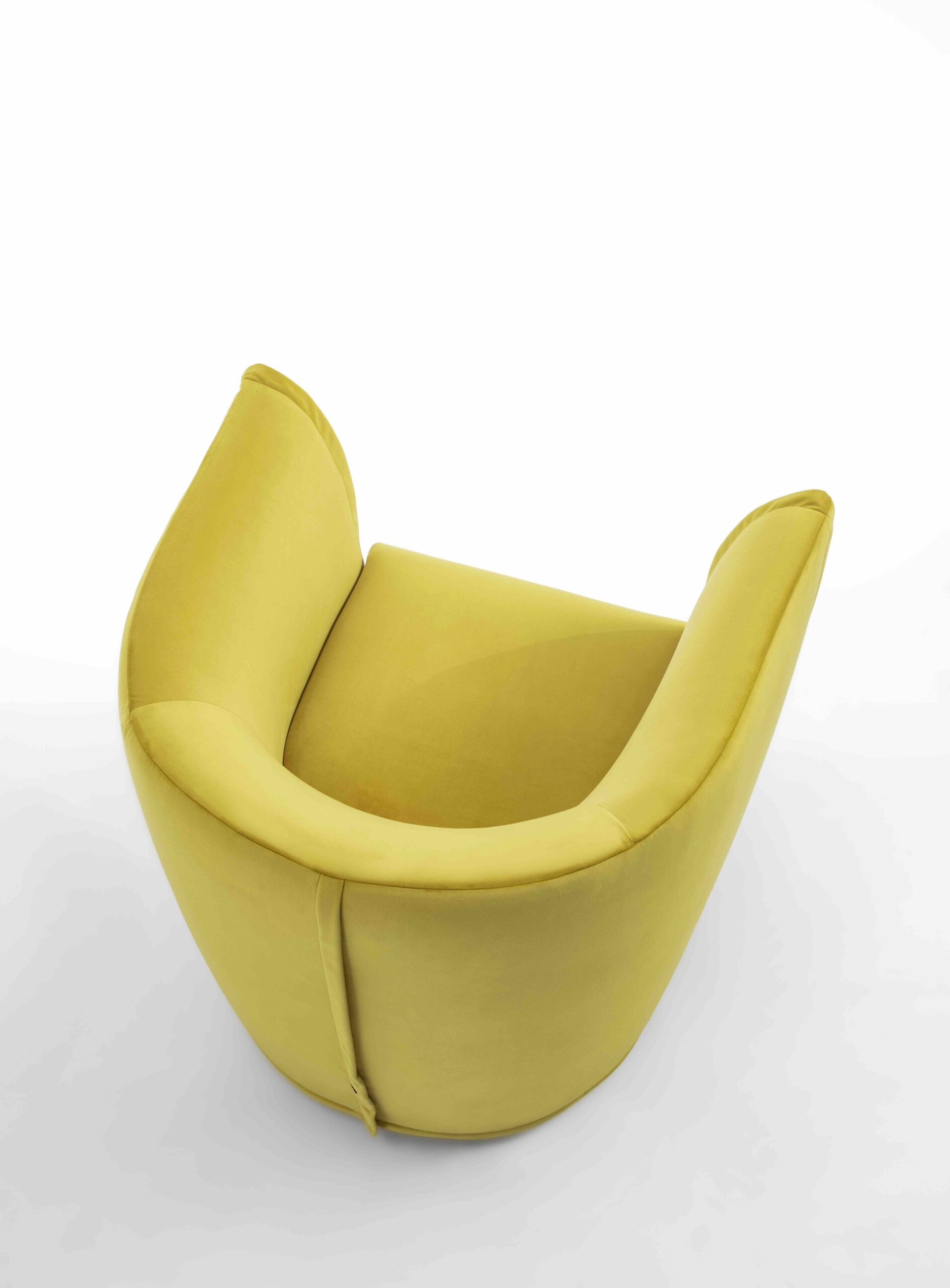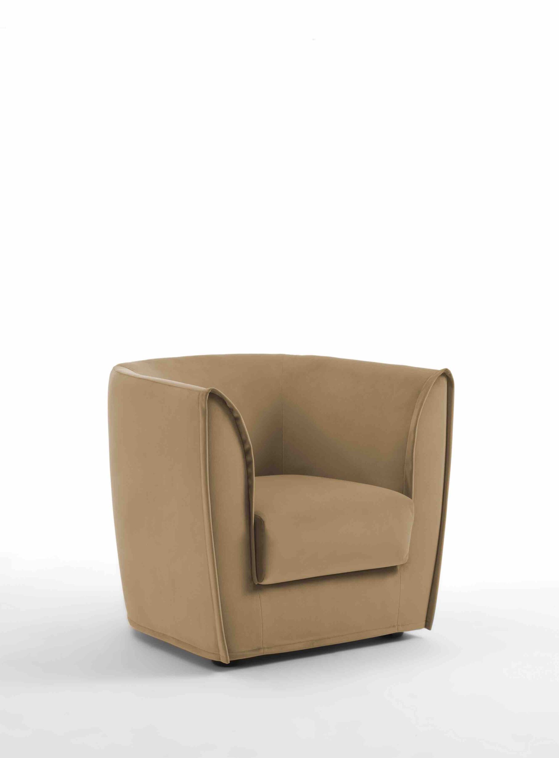 Le sue forme arrotondate e morbide sono ulteriormente valorizzate da una seduta realizzata in poliuretano espanso a doppia densità, un materiale scelto per garantire un comfort ottimale. A completare la struttura, uno strato di fibra di grosso spessore ne incrementa la piacevolezza al tatto e il sostegno ergonomico. Lo schienale, pur essendo integrato nella struttura portante della poltrona, conserva una morbidezza avvolgente che accoglie l’utente con impeccabile delicatezza, creando una sensazione di protezione e intimità.