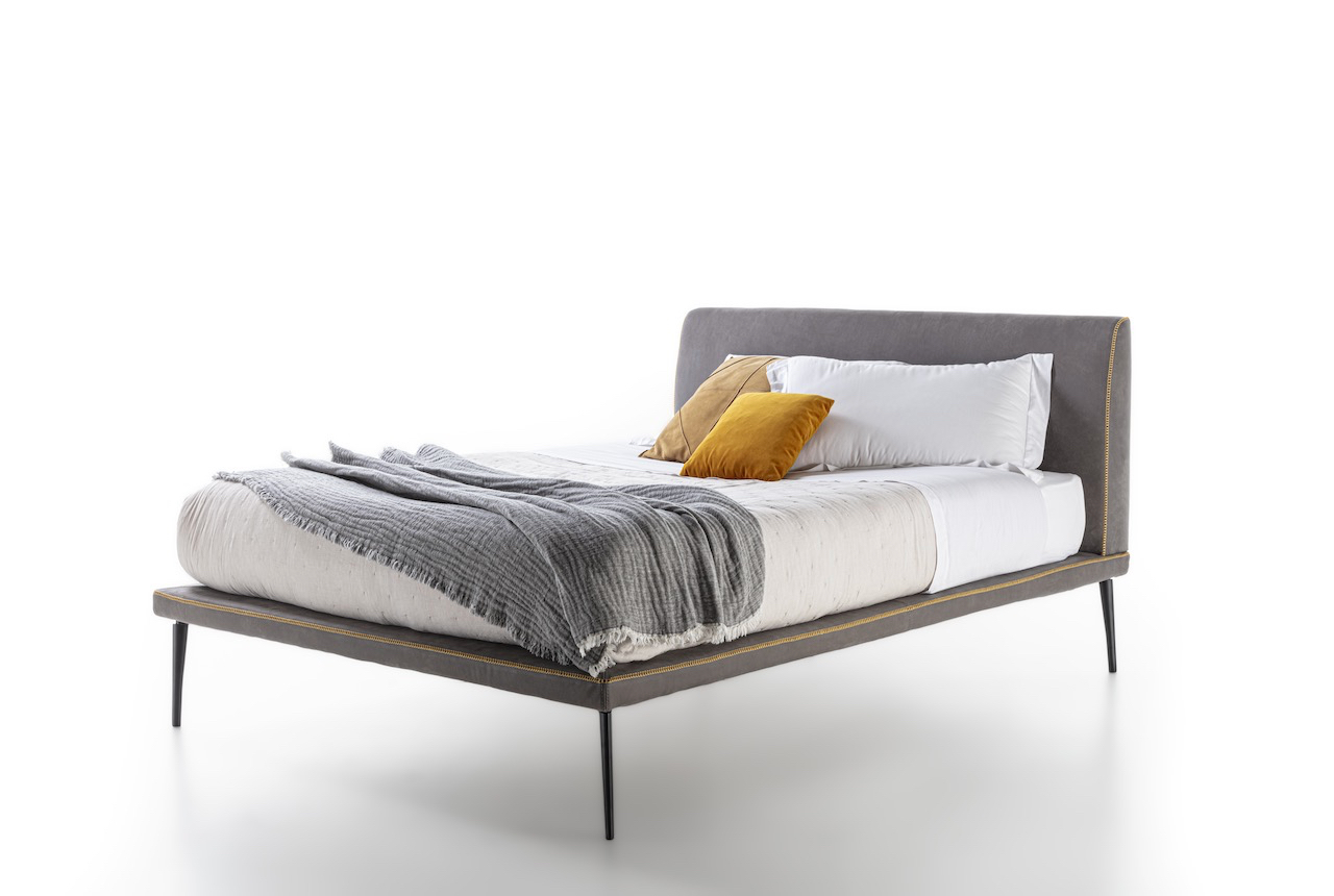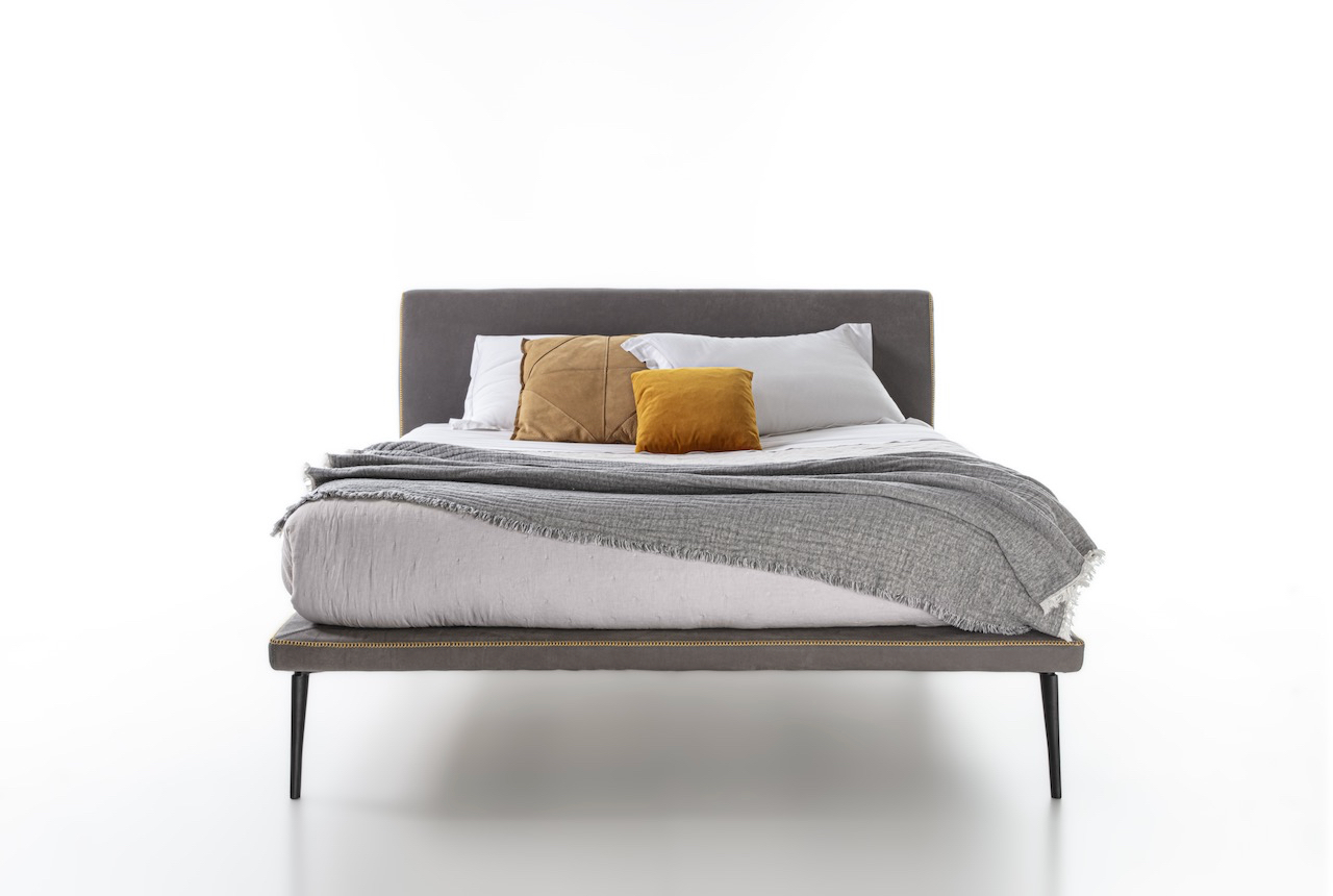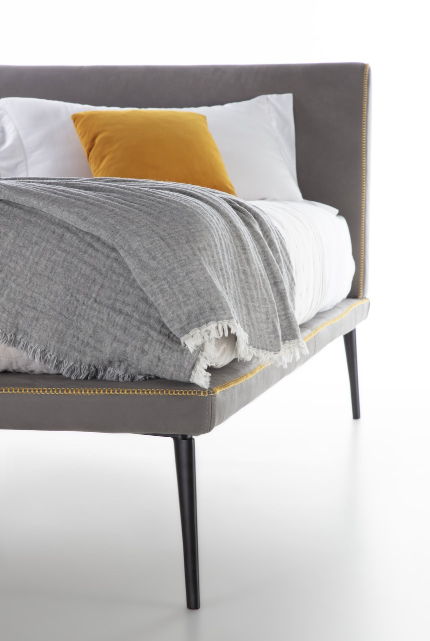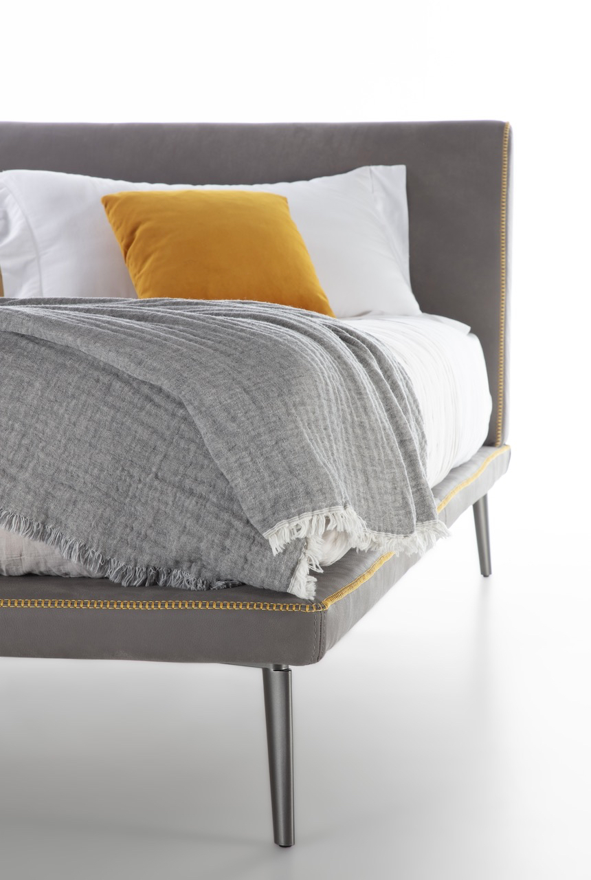 La struttura del letto Stelle è leggera, sospesa per mezzo di un piedino in fusione di alluminio bronzato. Uno spillo dal disegno che rimanda al classico creato appositamente per un letto senza tempo.