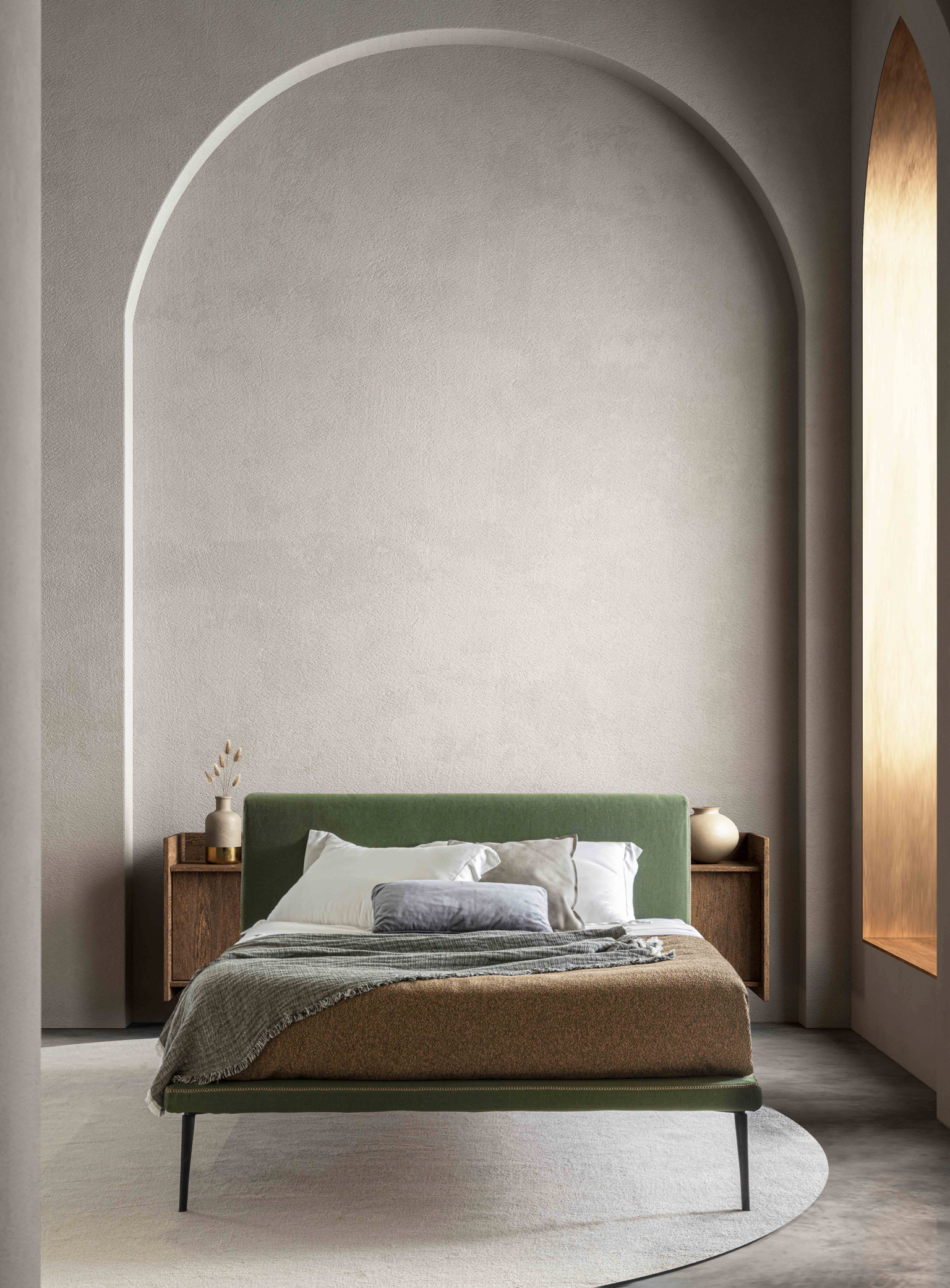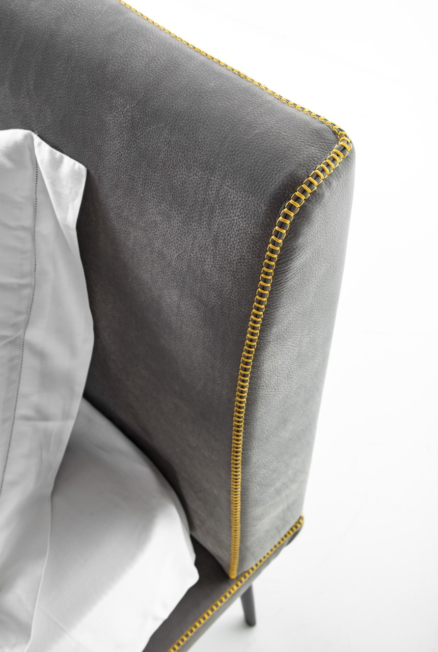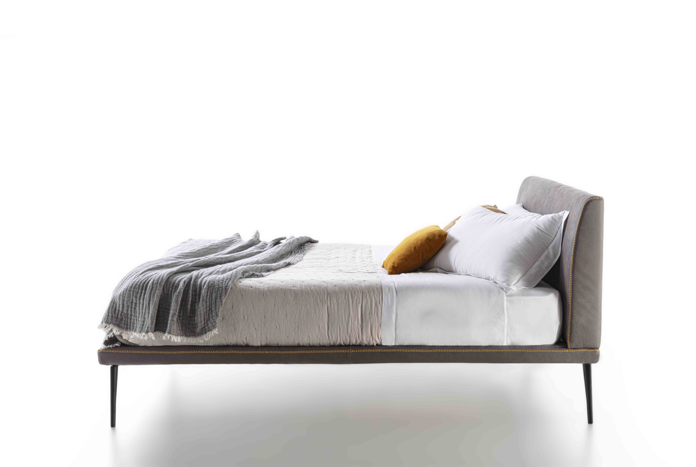 La struttura del letto Stelle è leggera, sospesa per mezzo di un piedino in fusione di alluminio bronzato. Uno spillo dal disegno che rimanda al classico creato appositamente per un letto senza tempo.