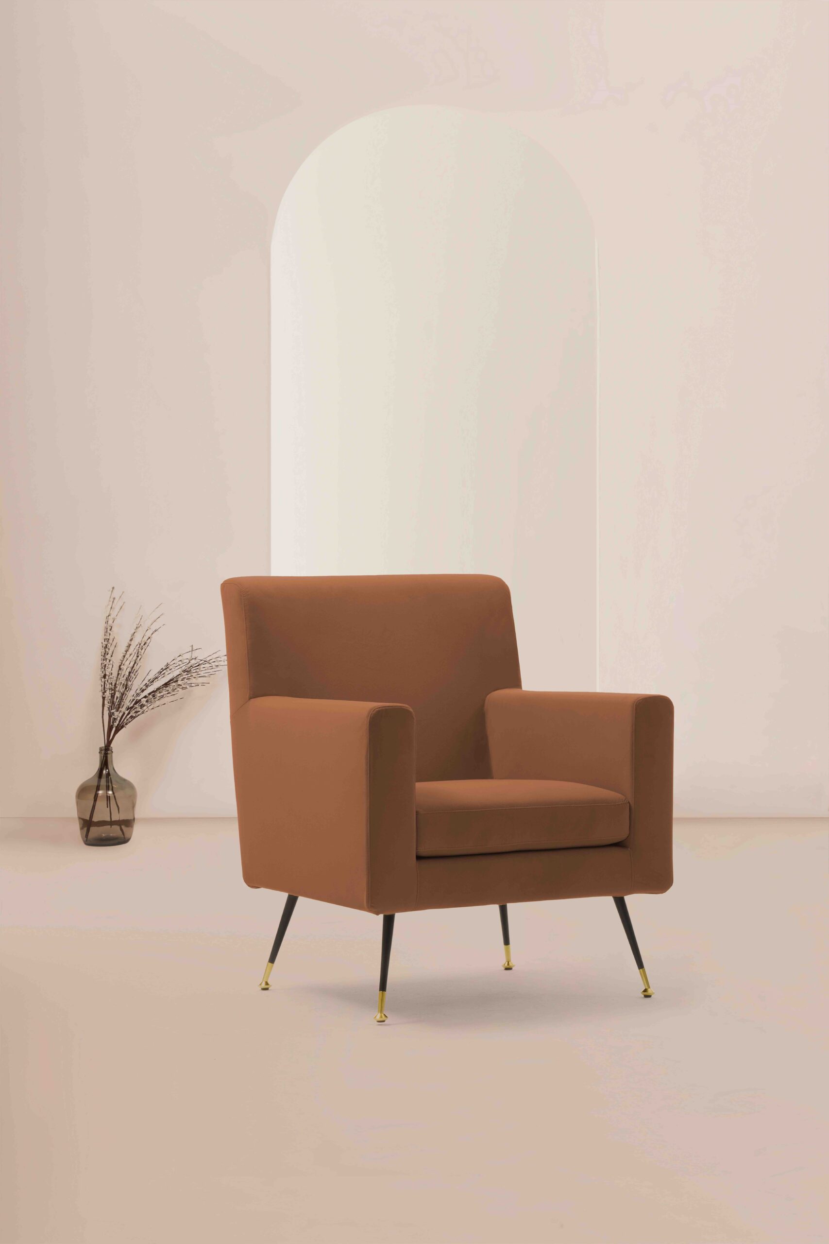 Ad enfatizzare il carattere ret della poltroncina Steve si aggiunge un rivestimento in pregiato velluto, che ne valorizza le linee e la rende ancora più ricercata. Richiamando le eleganti fantasie in voga in quegli anni, il tavolino presenta  un tessuto a trama floreale.